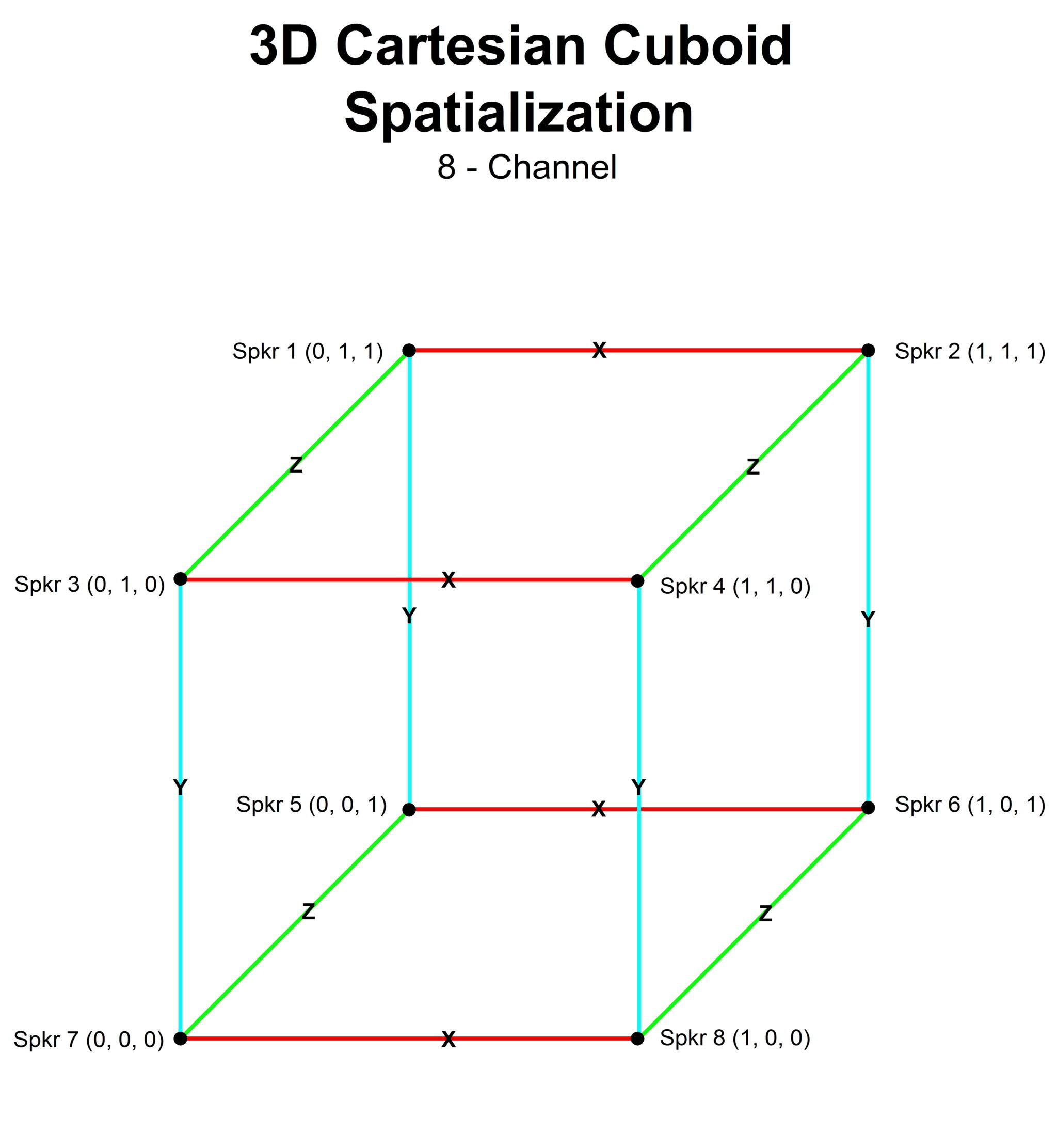 3D Cartesian Cuboid with Octangulation. The spatialization schema below was reviewed using an 8-channel 3D Cartesian cuboid with loudspeakers at the corners (coordinates in the unit cube). The system implements a vector-based amplitude panning (VBAP-like) approach generalized to 8 loudspeakers (“octangulation”) rather than the usual three, combined with convolution reverb to encode distance. Spatial perception results from the tandem action of amplitude panning across the 8 speakers and distance-related convolution processing. Event positions in (x, y, z) will be mapped to loudspeaker gains and distance algorithms in the Csound orchestra.