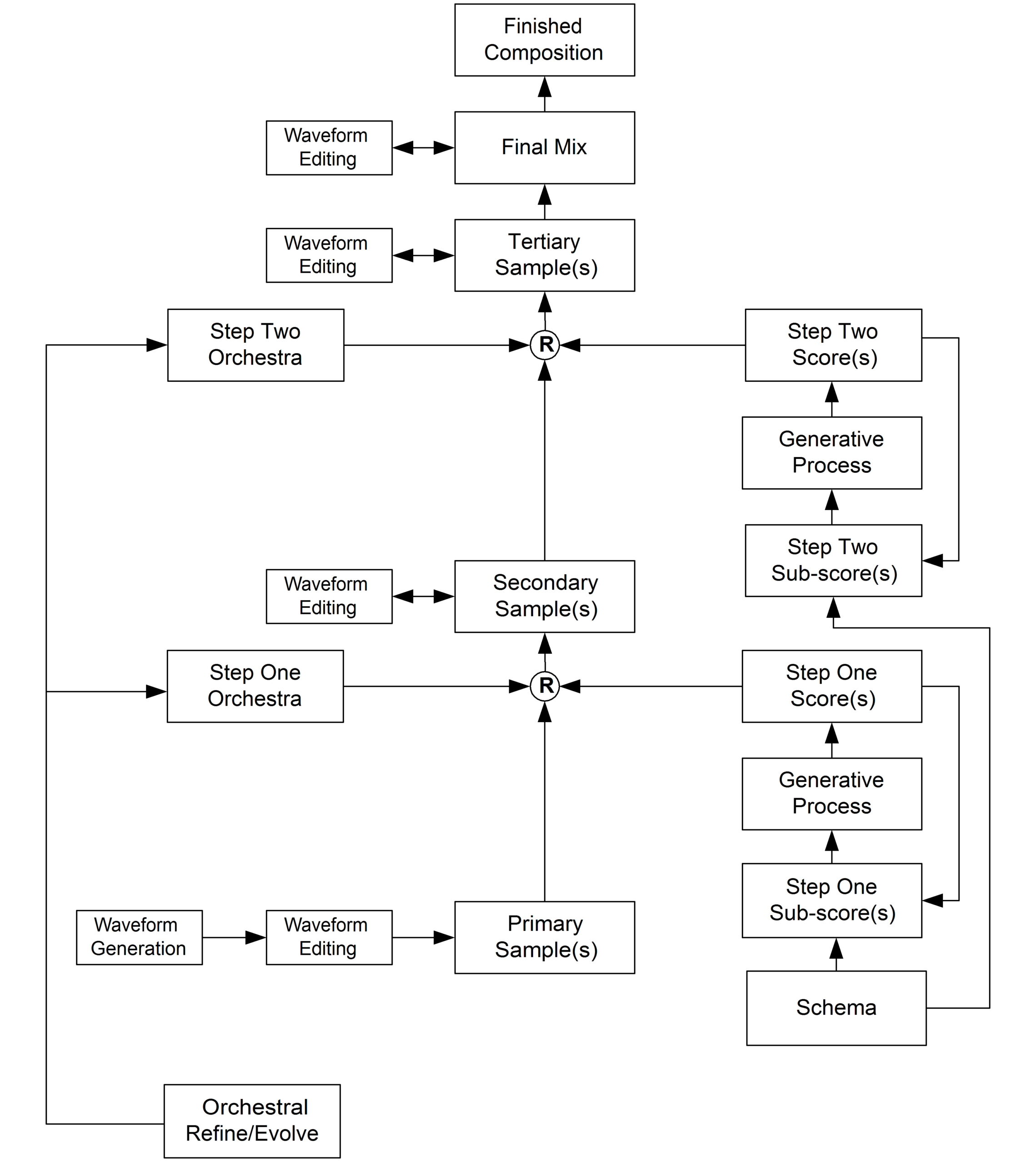 The diagram below reviewed showing a multi-stage process: waveform generation and editing leading to primary, secondary, and tertiary sample layers; Step One and Step Two orchestras driven by Step One and Step Two scores; and final waveform editing and mixing. Csound rendering stages (marked “R”) transform scores and orchestras into new audio material at each layer. Orchestral refinement/evolution operates as a feedback mechanism as listening and evaluation inform changes to the orchestras and workflows.
