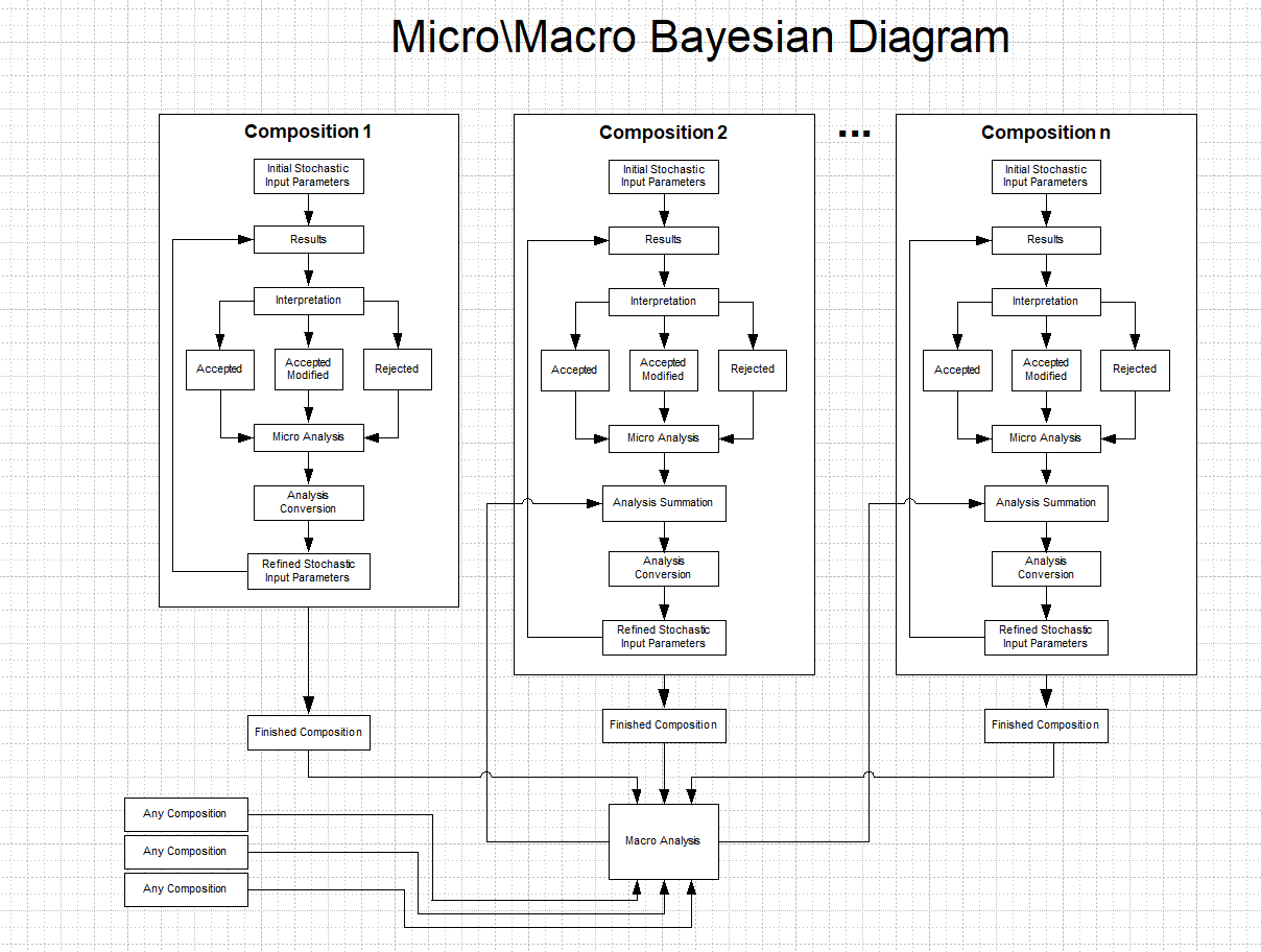 The Micro/Macro Bayesian diagram below was examined. At the micro level, each composition involves initial stochastic input parameters, generated results, interpretation, categorization of material as accepted/accepted-modified/rejected, micro analysis, and analysis conversion into refined stochastic parameters. At the macro level, finished compositions feed into macro analysis across works, updating higher-level priors for future compositions. This framework closely matches the intended behavior of the ChatGPT–Csound system, with evaluations guiding parameter refinement over successive interactions.